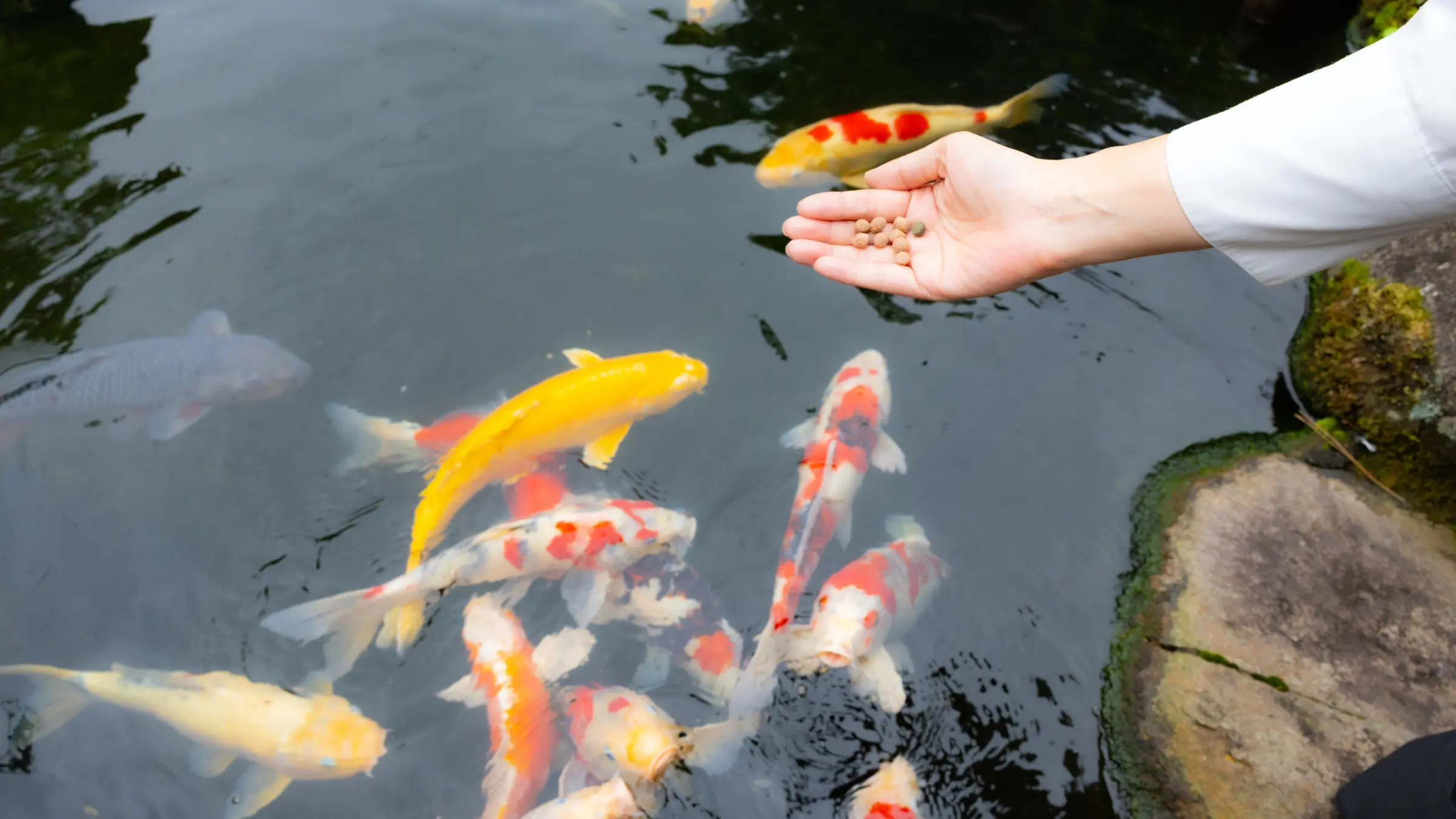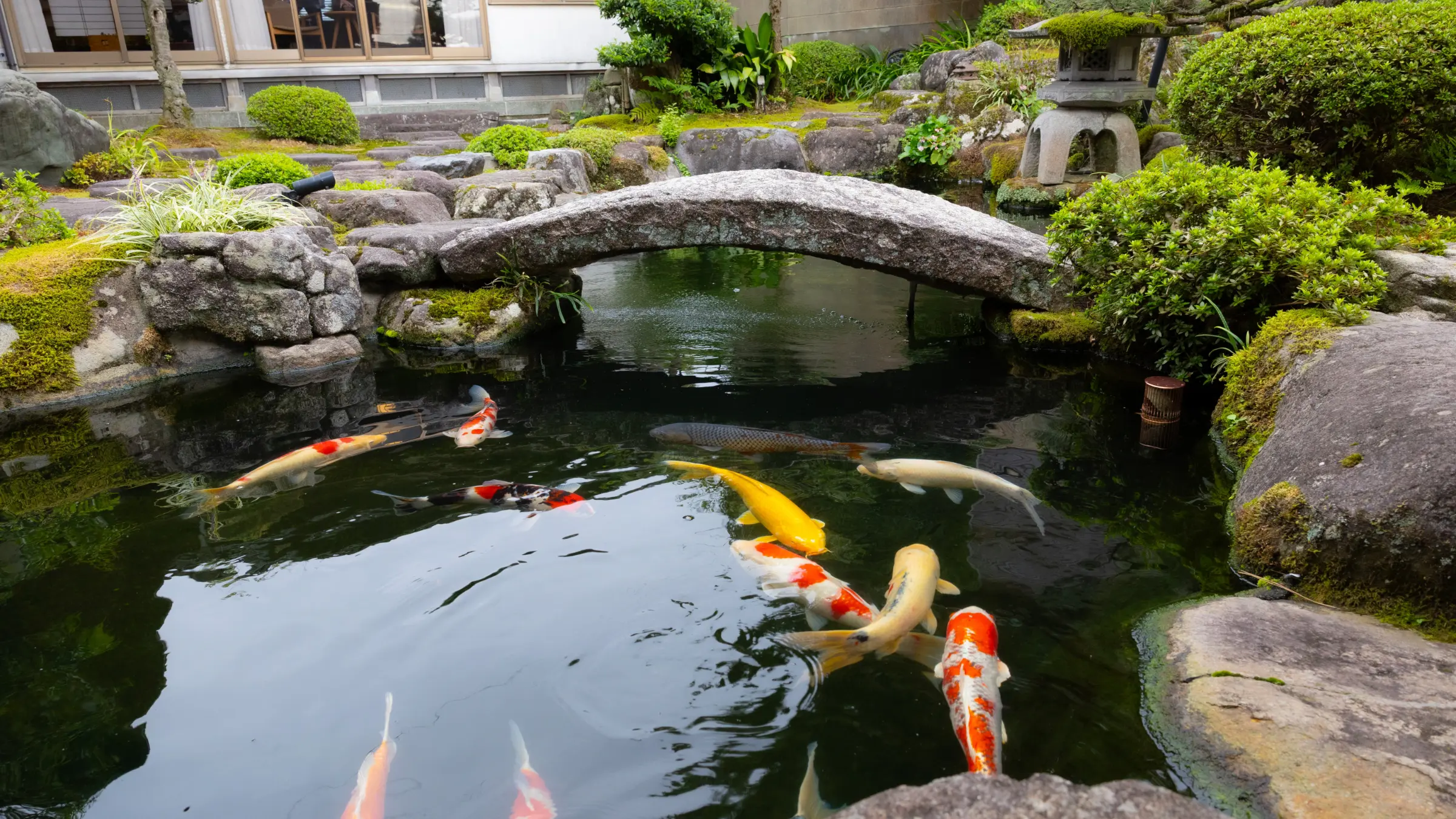 中央の池では優雅に泳ぐ鮮やかな錦鯉が、簡素な趣のある庭園に美しく映えています。